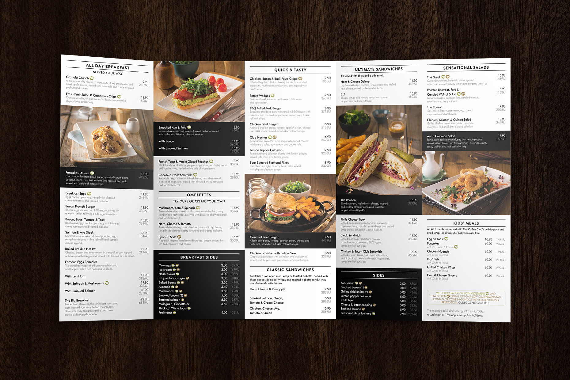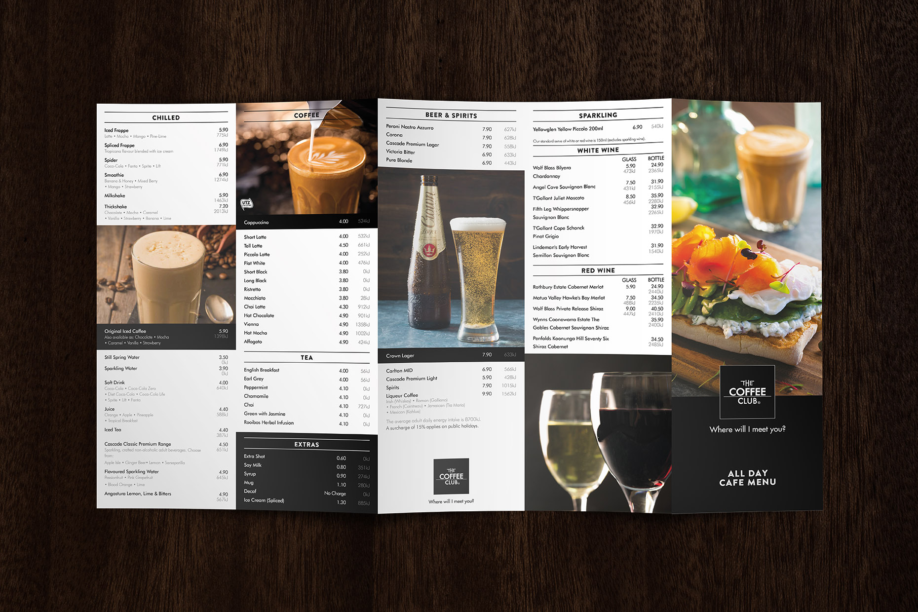 The Coffee Club wanted to refresh their menu so it could be read as one fold out design, as well as incorporate imagery throughout the menu. They were concerned that this can sometimes look tacky.